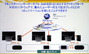 その敷居をぐっと低くするのが今回発表された機能であり、PS3を経由してPLAYSTATION@Networkサーバーにアクセスすることで、アドホックモードのゲームが複数人でプレイできるようになる。