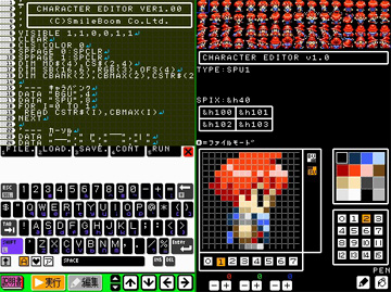あらかじめグラフィックスやBGMなどのプリセットデータが用意されていて、機能サンプルプログラムが7種類、ゲーム3種類、そしてキャラクター画像作成ツールと背景用マップエディター、そしてグラフィックツールの13種のプログラムを同梱している。